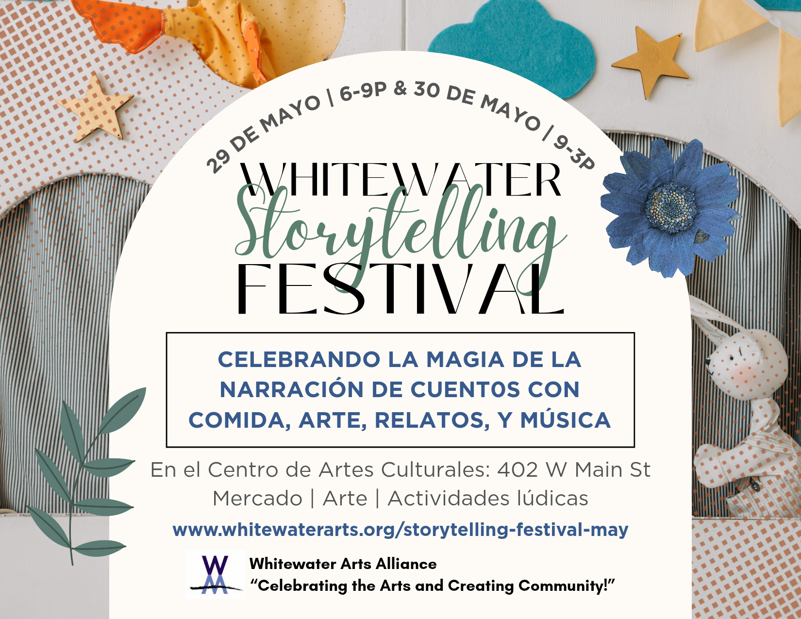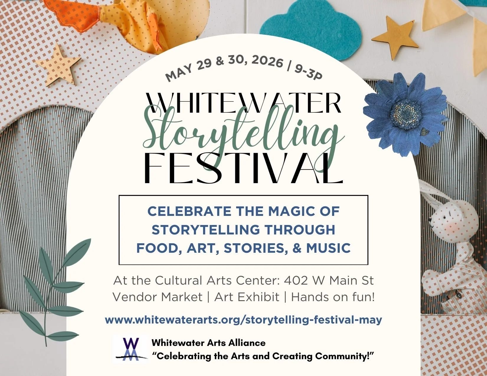 Join the Whitewater Arts Alliance and community for our two-day Whitewater Storytelling Festival at the historic Cultural Arts Center to celebrate the magic of storytelling through words, music, food, and creativity. Enjoy engaging storytellers & strolling musicians, explore local art & a vendor market, savor great food, or join an interactive workshop or hands-on creative activity!