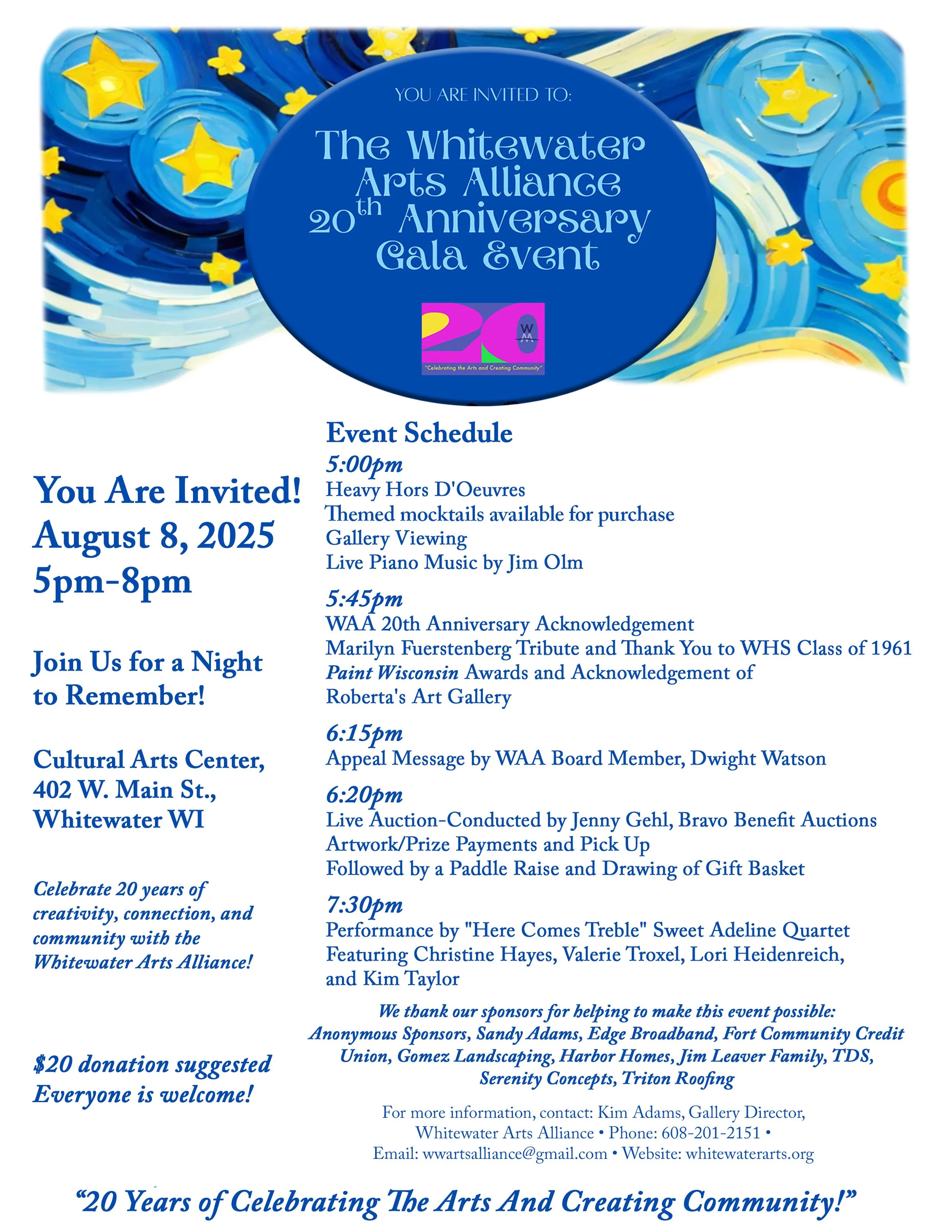 Everyone is welcome to the Cultural Arts Center for an evening of food, drink, art, and music in celebration of Marilyn Fuerstenberg, the Whitewater Arts Alliance, and community. Many thanks to our sponsors for making this event possible: Anonymous sponsors, Edge Broadband, Fort Community Credit Union, Gomez Landscaping, Harbor Homes, Jim Leaver Family, Sandy Adams, Serenity Concepts, TDS, and Triton Roofing.