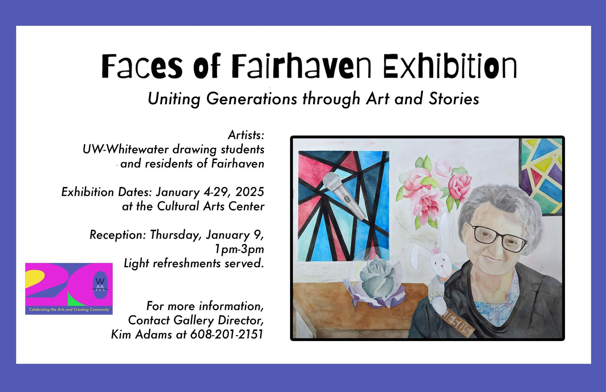 The Whitewater Arts Alliance (WAA) is pleased to announce the opening of the "Faces of Fairhaven" exhibit at the Cultural Arts Center Gallery. Running from January 4-26, 2025, this special exhibition celebrates the vibrant community spirit of Fairhaven through a unique collaboration between UW-Whitewater drawing students and Fairhaven residents.