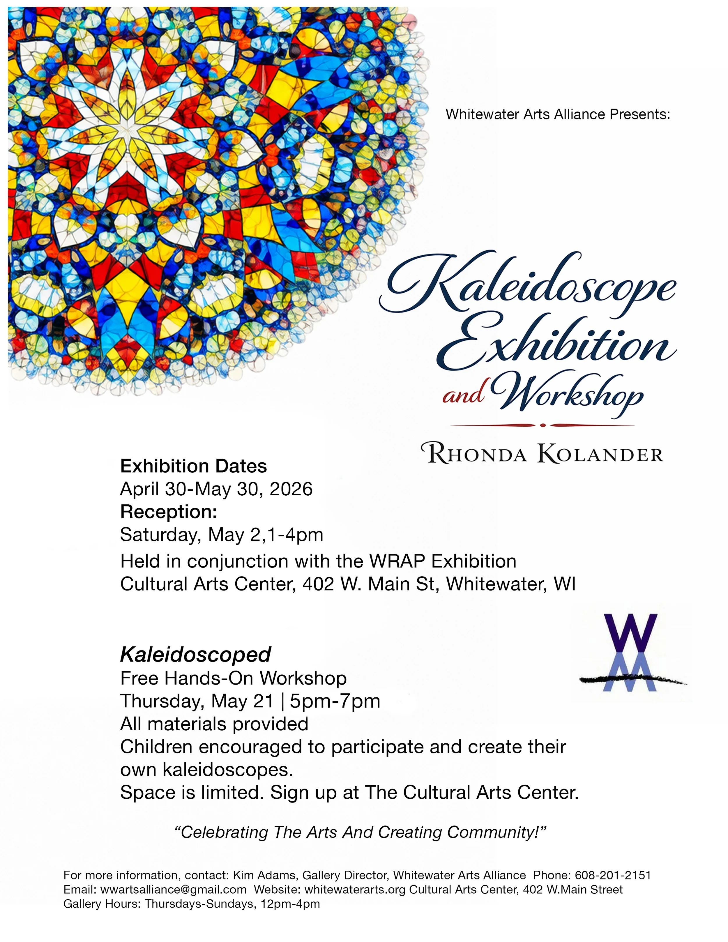 The Whitewater Arts Alliance (WAA) is pleased to announce "The Kaleidoscope Exhibition," a vibrant exhibition of mandala-inspired works by artist Rhonda Kolander. The exhibition will be on display at the Cultural Arts Center in Whitewater from Thursday, April 30, 2026, through Saturday, May 30, 2026.