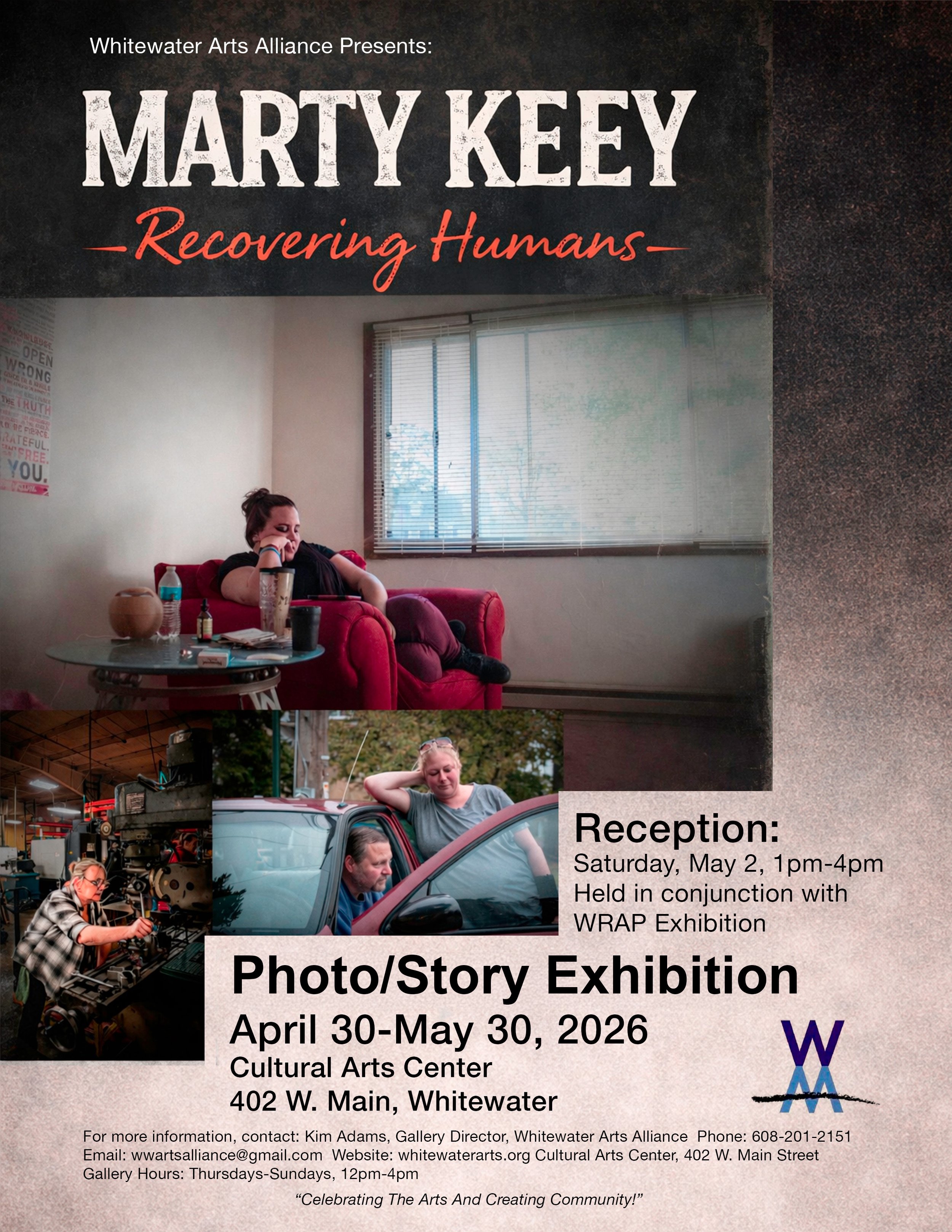 The Whitewater Arts Alliance (WAA) is honored to announce the upcoming exhibition, "Recovering Humans," a poignant photo-and-story series by celebrated artist Marty Keey. The exhibition will be on display at the Cultural Arts Center in Whitewater from Thursday, April 30, 2026, through Saturday, May 30, 2026.