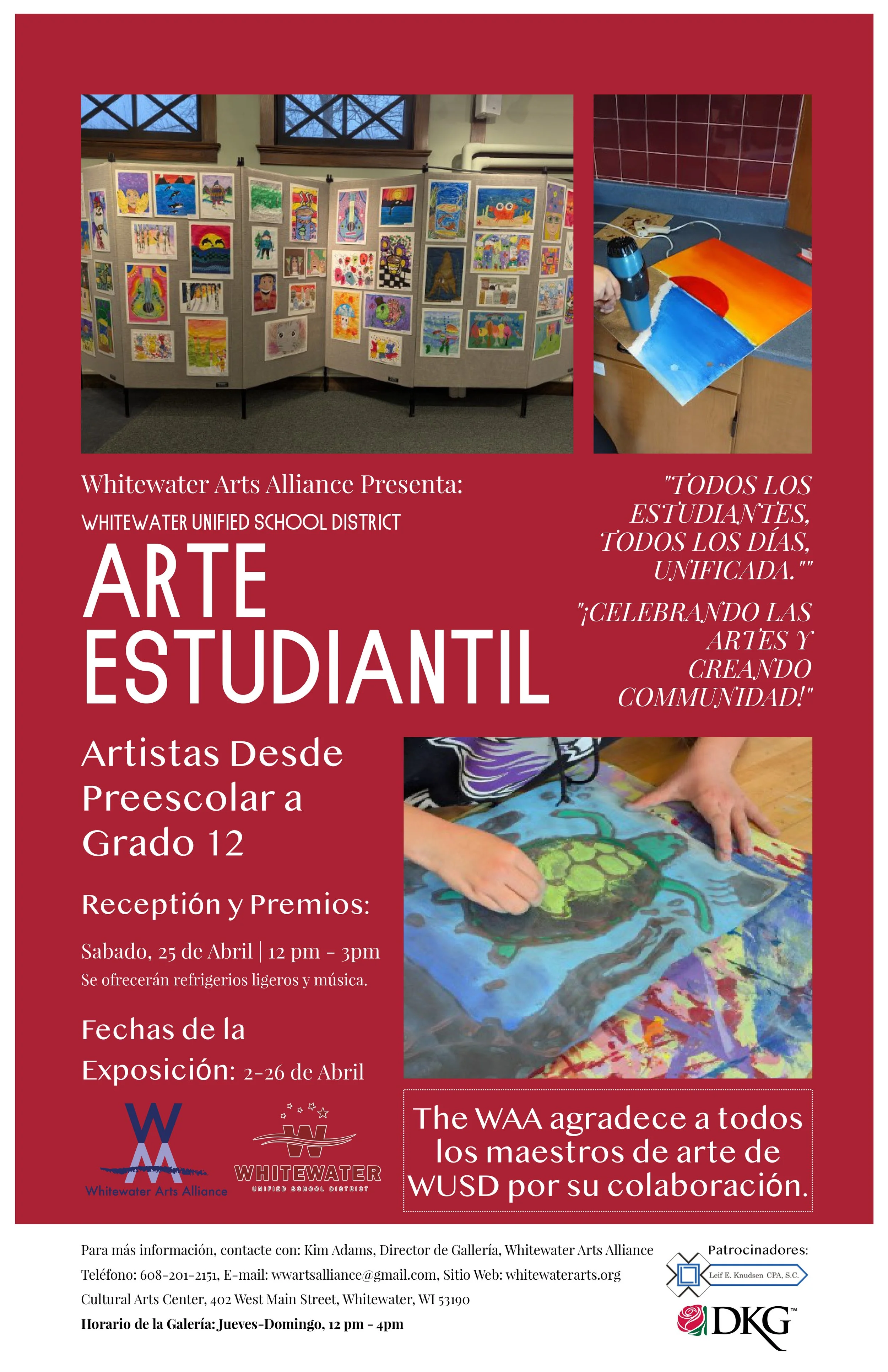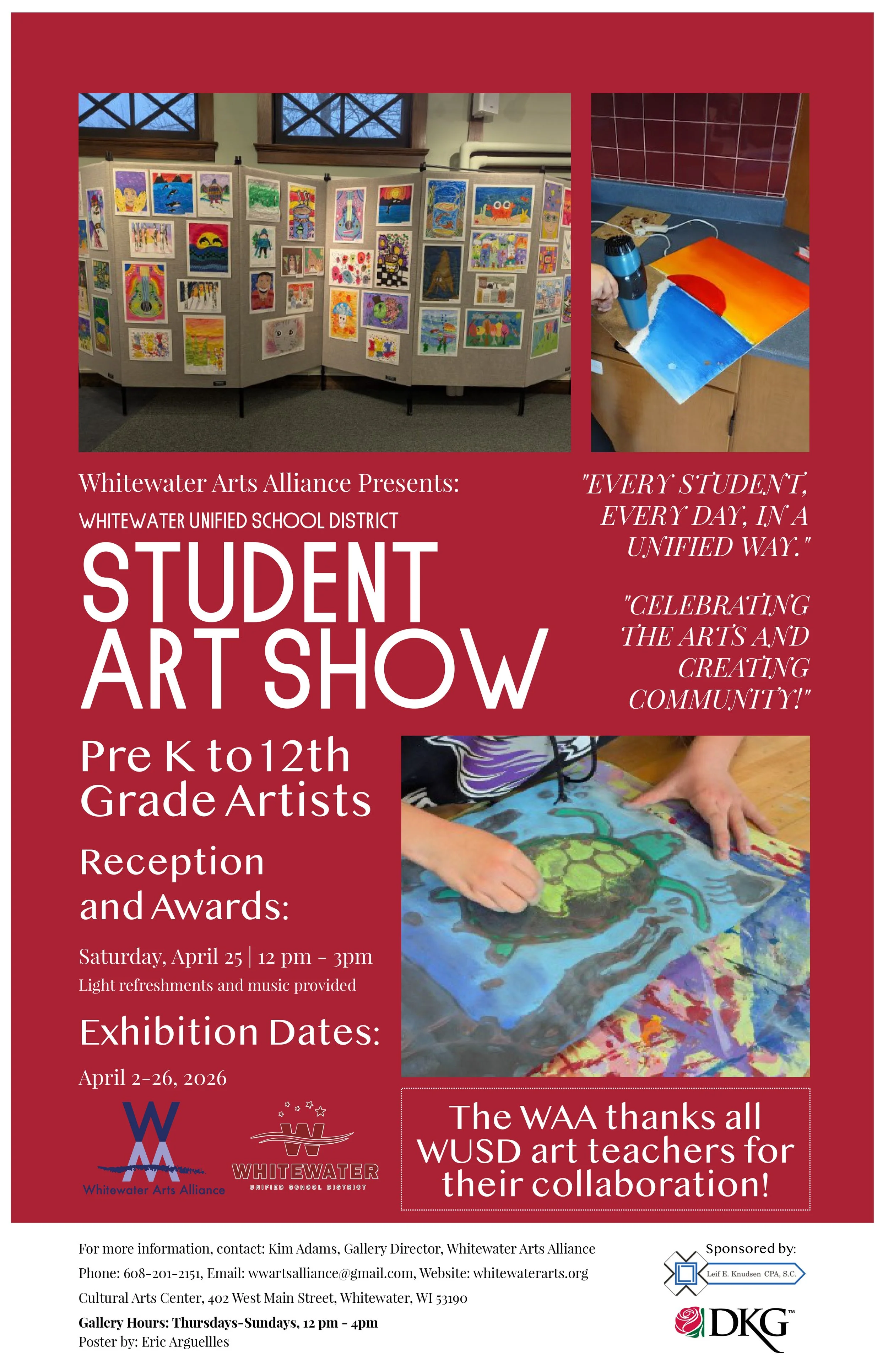 The Whitewater Arts Alliance (WAA) is pleased to present the 2026 Whitewater Unified School District Art Show, an annual exhibition that highlights student creativity and reflects the district’s guiding belief: “Every Student, Every Day, in a Unified Way.” The exhibition runs from April 2–26, 2026 at the Cultural Arts Center, 402 W. Main Street in Whitewater, and features artwork from K–12 students across the district in a variety of media and styles.